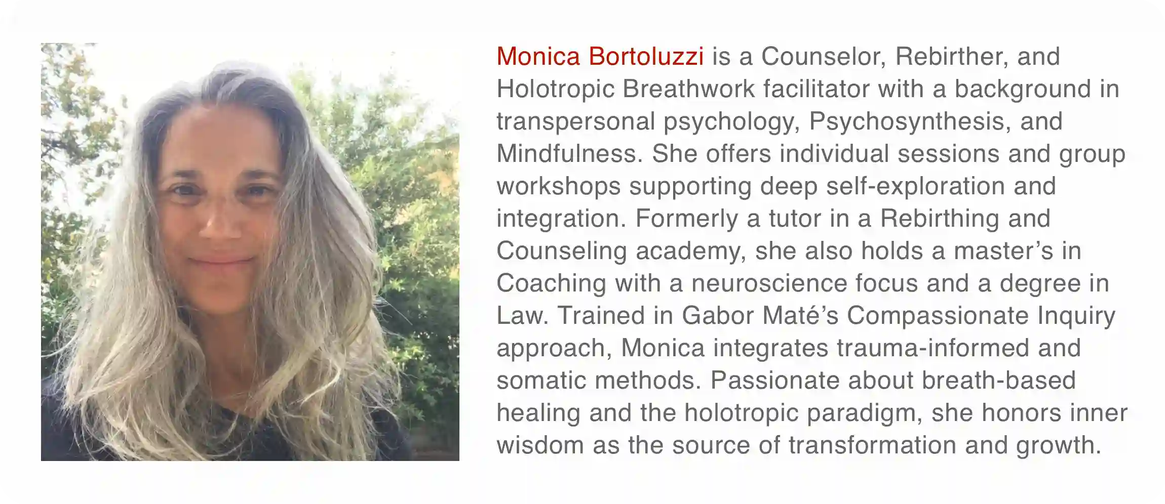 This 3.5-day, experiential Double Holotropic Breathwork workshop allows for self-healing and self-exploration as well as accessing the roots of emotional and psychosomatic challenges one might face. During the workshop, four breathwork sessions (two as a breather and two as a sitter) will allow you, in a very safe setting, to access an expanded state of consciousness, in which your own wisdom connects with your inner healing and transforming power. This healing wisdom guides the experience towards those aspects which carry an emotional charge, and are ready to be processed or integrated.